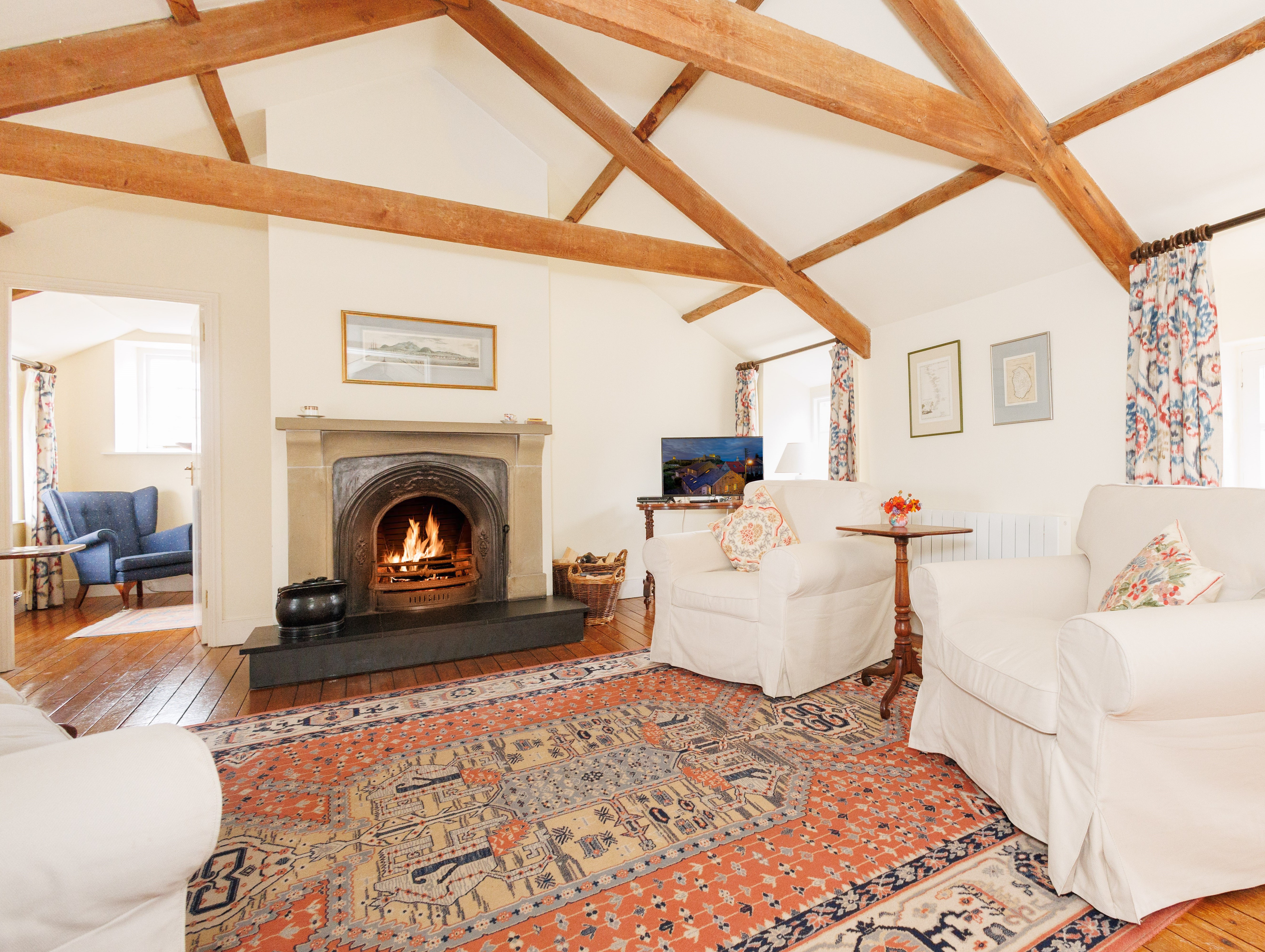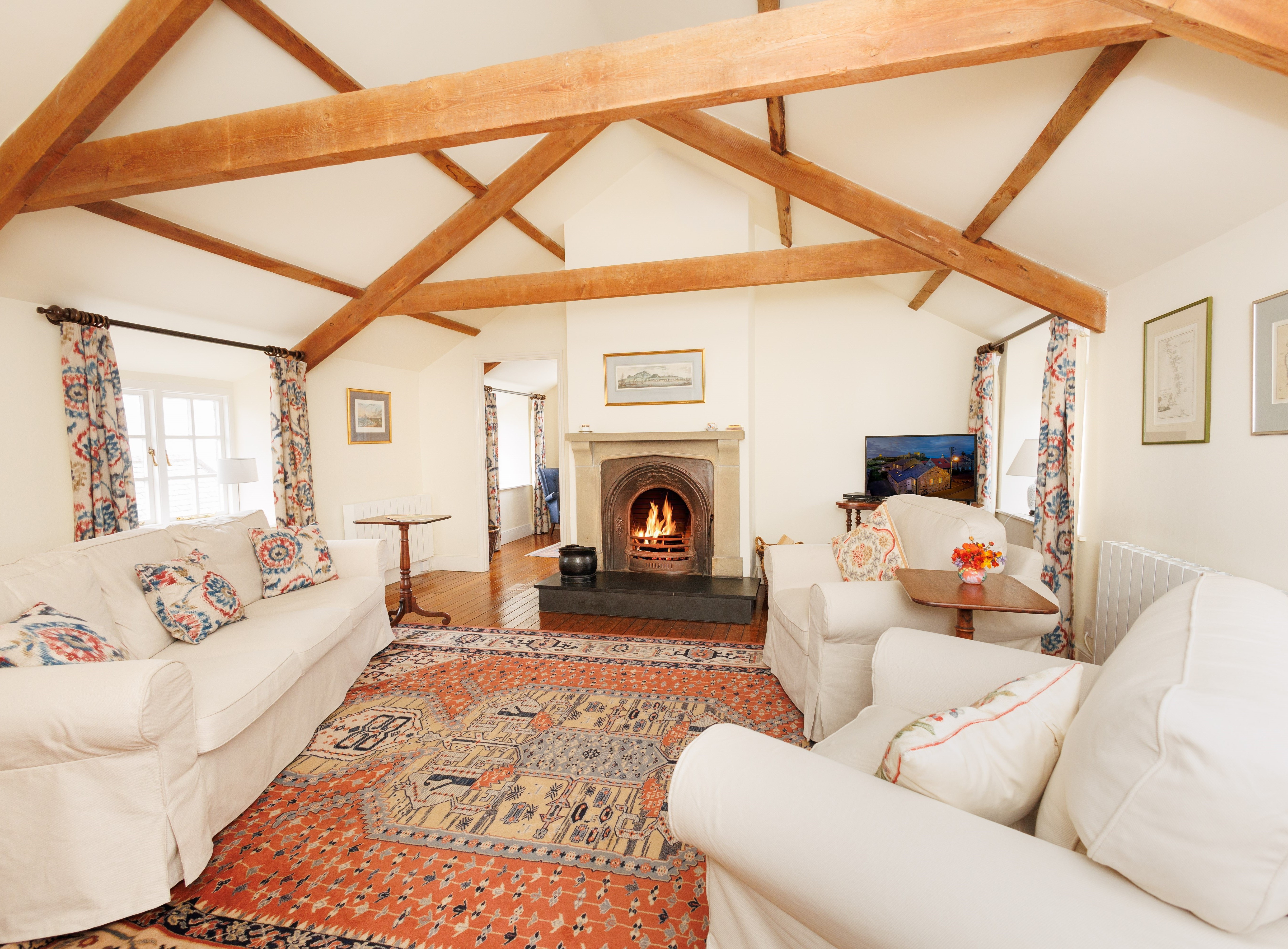 The kitchen-dining room with seating for six is the heart of the cottage and a fully equipped kitchen with everything you need to whip up delicious meals during your stay. Upstairs is a comfortable lounge with a plush sofa and a traditional fireplace. Outside, the cottage has a private garden with a paved seating area, perfect for al fresco dining on warm summer evenings.
